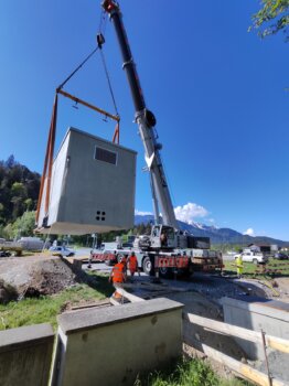 Die robuste Kabine aus Beton wurde von unserem Partnerunternehmen Fanger Elementtechnik AG in Giswil (Obwalden) vorgefertigt. Mit einem Gesamtgewicht von rund 50 Tonnen und den beeindruckenden Aussenmassen von 8.36 x 3.28 Metern war für den Transport und das Versetzen Präzision gefragt. Zum Einsatz kam ein 200-Tonnen-Kran der Firma Fanger Kran AG, mit dem die Kabine millimetergenau an ihren Standort versetzt werden konnte.