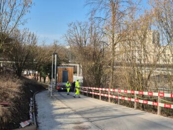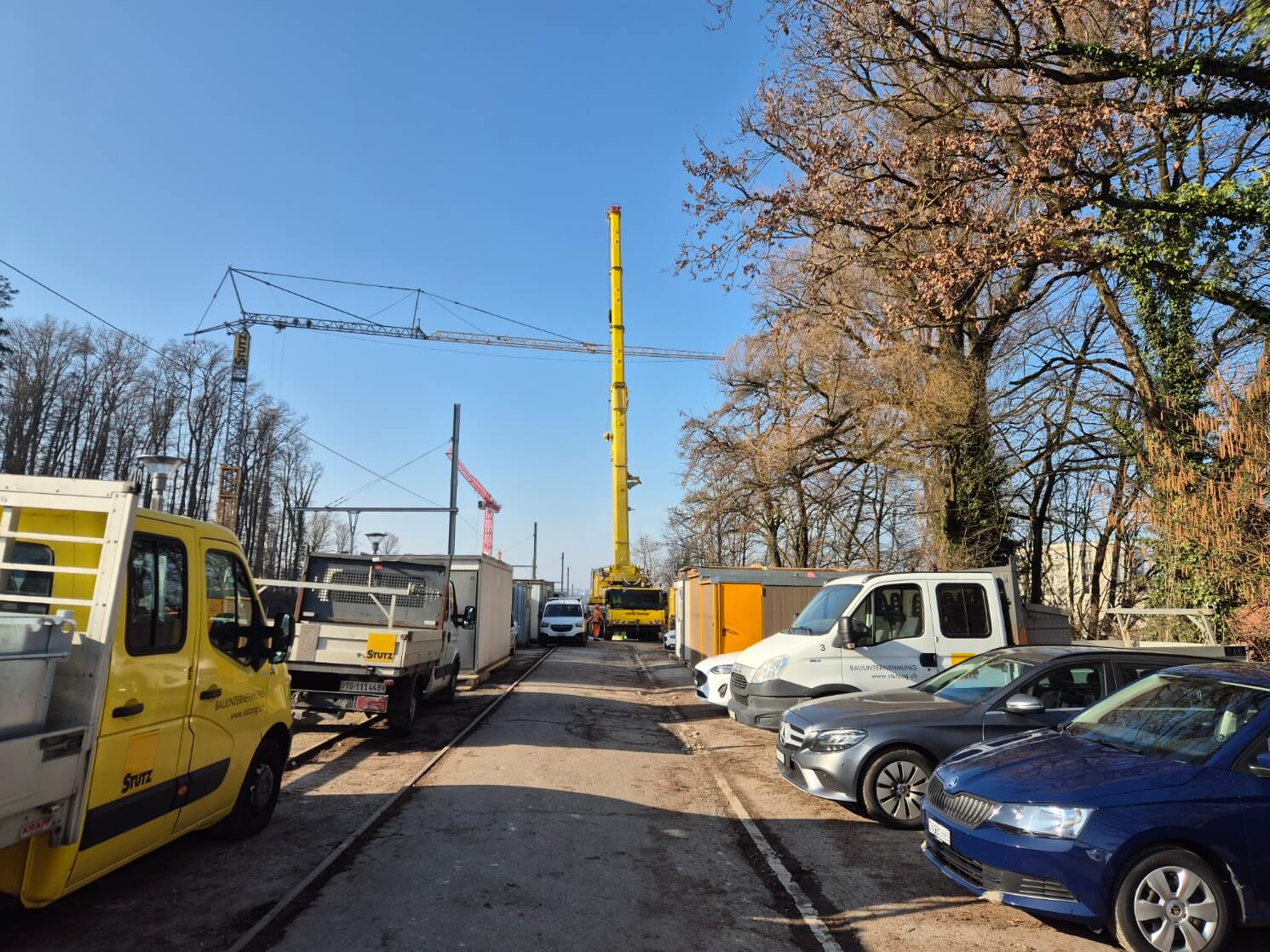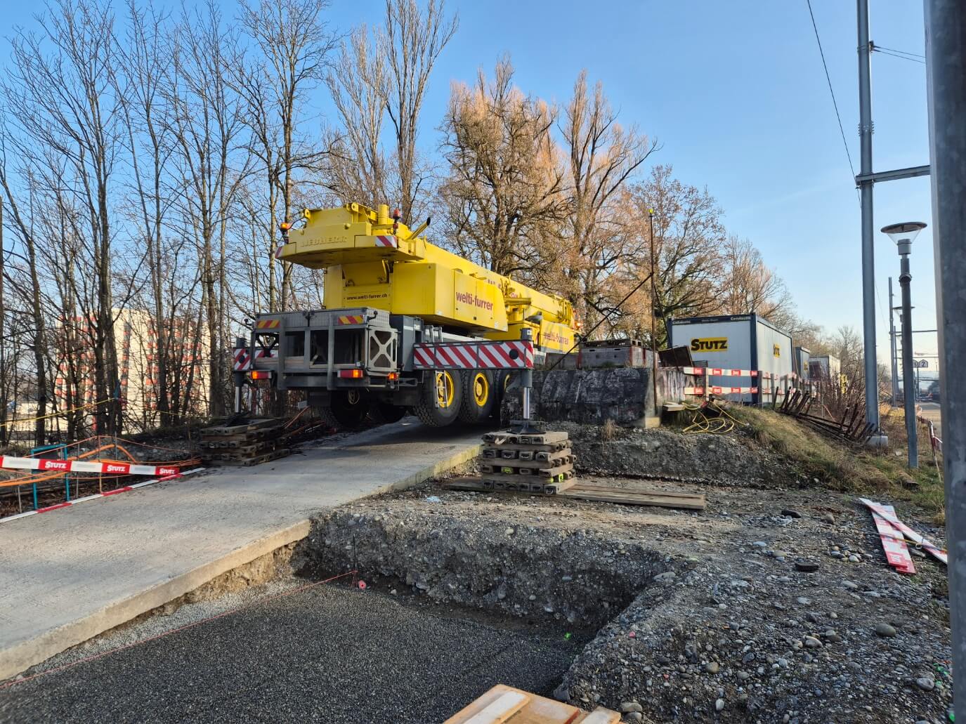 Die Montage war von mehreren Herausforderungen geprägt, die eine detaillierte Vorbereitung erforderten. Der Montageort liegt direkt neben den Gleisen und in unmittelbarer Nähe zu Hochspannungsleitungen, zudem befindet sich die Stelle auf einer Anhöhe. Um die Zufahrt für den schweren LKW‑Kran mit 12‑t‑Achslast und die Tieflader zu ermöglichen, musste vorab eine Zufahrtsstrasse betoniert werden. Diese Massnahme war entscheidend, damit die grossen Fahrzeuge sicher anfahren und rangieren konnten.
