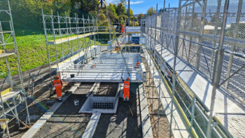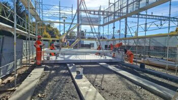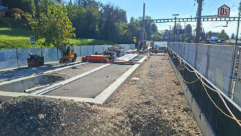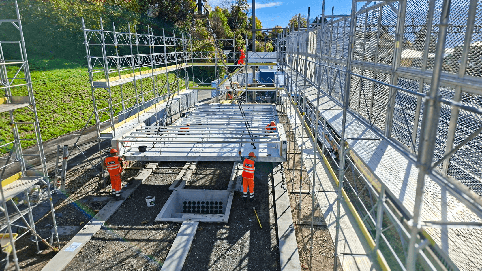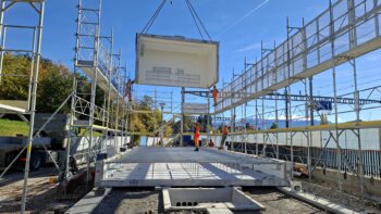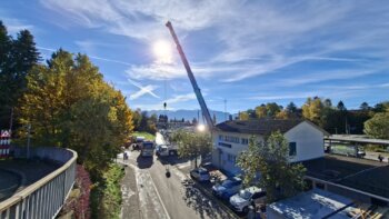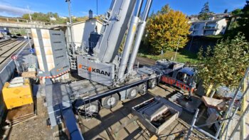 Die Montage der BTG-Elemente war eine logistische Herausforderung: Direkt beim bestehenden Bahnhof mussten die tonnenschweren Elemente präzise positioniert werden. Ein 650-Tonnen-Kran von Fanger übernahm die anspruchsvolle Hebearbeit, wobei die engen Platzverhältnisse und die Nähe zu Gleisanlagen besondere Sorgfalt erforderten.